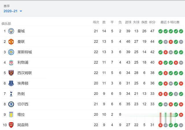 另外球迷们关心的其他几支六巨头球队也在前十之内,热刺同样少赛两轮,20轮33分排第七,切尔西21轮33分排第八,维拉20轮32分排第九,阿森纳22轮31分排第十。