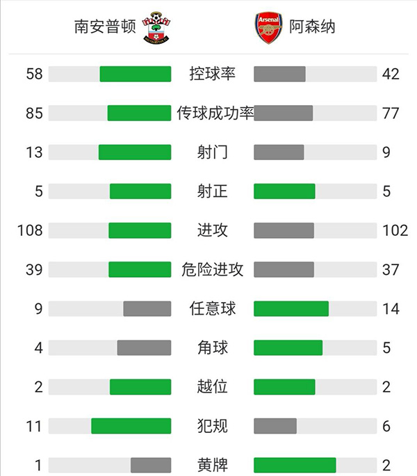 全场比赛结束,阿森纳做客3-1击败圣徒。