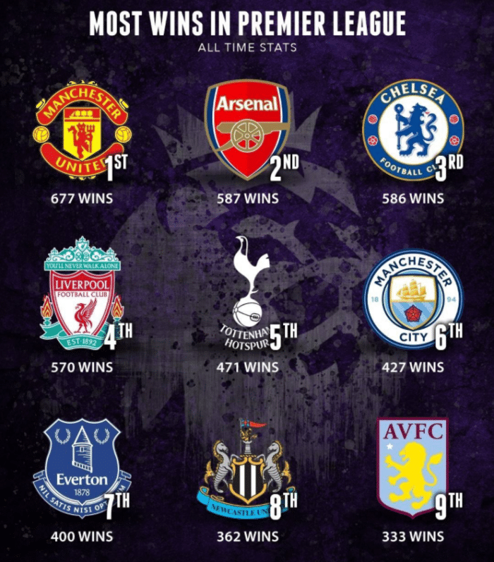 如图,曼联是英超历史上胜利场次最多的球队,曼联在英超赛场上一共拿到了677场胜利,当然曼联拿到这个成绩也非常正常,毕竟人家夺冠最多。不过,曼联的胜场大部分都是在弗格森时代,可以说是弗格森创造了辉煌的曼联。而第二的是阿森纳,阿森纳在英超赛场上拿到了587场胜利,毕竟温格时期的阿森纳,也是英超的霸主级别球队。