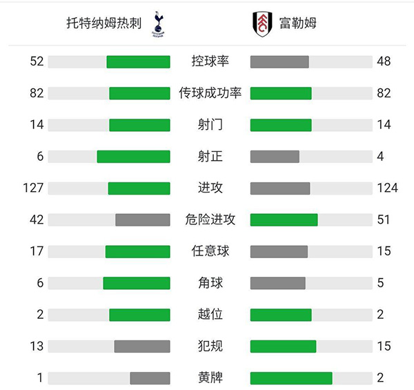 全场比赛结束,热刺主场1-1战平富勒姆。