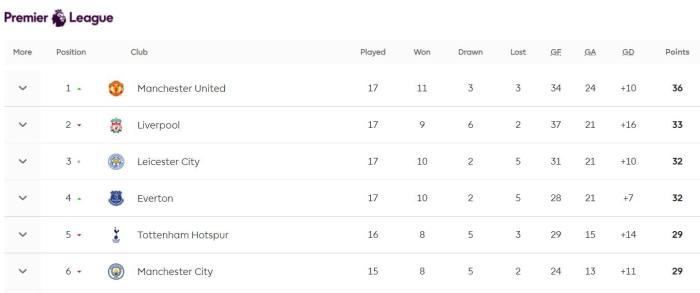 具体到本赛季每一轮英超的第一名球队如下:第1轮领头羊,阿森纳;第2~3轮领头羊,莱斯特城;第4~6轮领头羊,埃弗顿;第7轮领头羊,利物浦;第8轮领头羊,莱斯特城;第9~12轮领头羊,热刺;第13~17轮领头羊,利物浦。