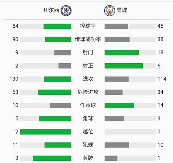 第34分钟,斯特林中圈附近得球一路杀到禁区中路,他单刀面对门将在犹豫之下的打门被门柱挡出,德布劳内跟进补射得分,曼城3-0切尔西。