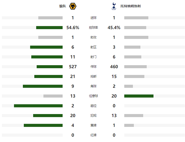 24直播网讯:北京时间12月28日03:15,英超第15轮,热刺客场挑战狼队。上半场开场不久恩东贝莱远射破门,随后还多次策动有威胁进攻。下半场热刺较为被动,赛斯头球扳平比分。最终,热刺1-1狼队。