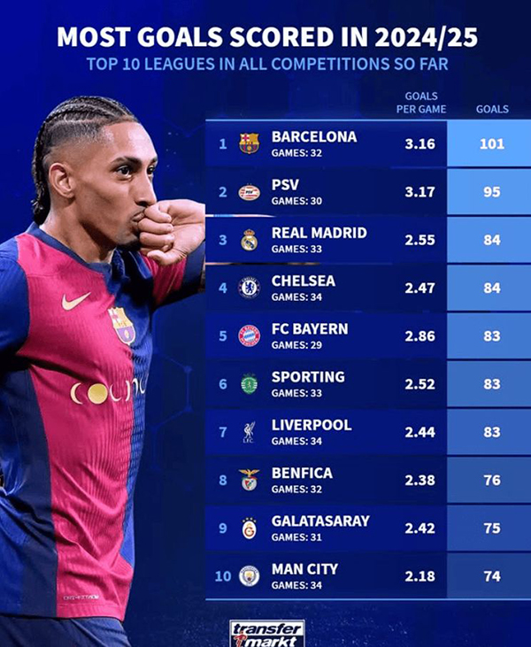 24直播网讯 德转统计了欧洲前十联赛本赛季各项赛事的进球榜,巴萨32场比赛,打进101球最多。