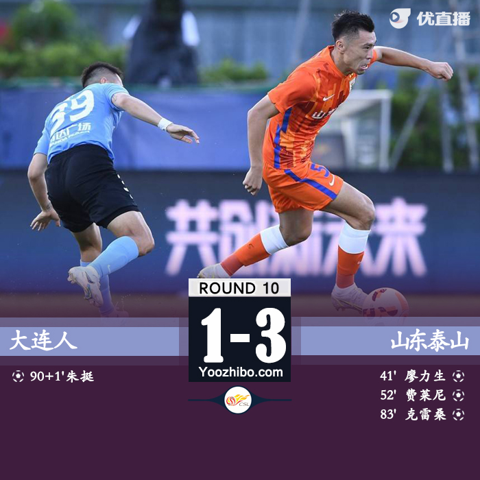 24直播网 7月10日讯 北京时间7月10日晚上18:30,中超联赛第10轮,山东泰山对阵大连人。上半场,孙准浩伤退廖力生替补,闫相闯爆射中柱,廖力生世界波破门。半场战罢,山东泰山暂1-0大连人。下半场费莱尼破门,克雷桑锁定胜局,朱挺补时扳回一球。全场结束,山东泰山3-1大连人。