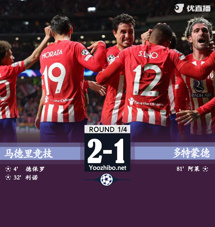 24直播网讯:北京时间4月11日欧冠1/4决赛首回合,马德里竞技主场对阵多特蒙德。上半场德保罗抢断首开记录,维特塞尔蝎子摆尾打门被扑,利诺破门扩大比分,下半场阿莱扳回一球,布兰特中柱。最终比分马竞2-1多特蒙德。