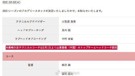 在鹿岛鹿角的官网中写道,技术教练黑崎久志将从2月1日起担任山东鲁能泰山(中国)的主教练。