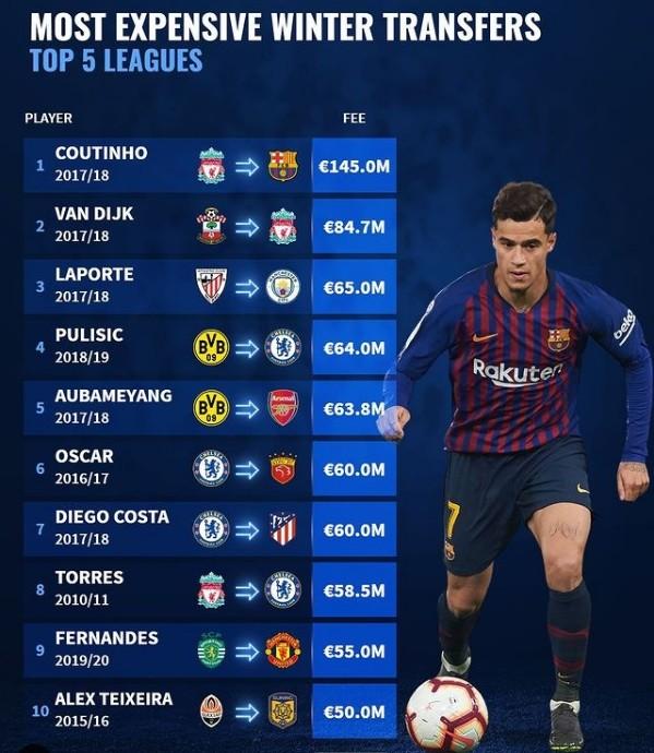 18年冬天,巴萨花费了1.45亿欧元签下了库蒂尼奥,这是足坛冬窗转会最高身价。随后就是利物浦花费了8470万欧元从南安普顿签下的范迪克。再往后就是曼城花费6500万欧元从毕尔巴鄂竞技签下的拉波特。再往后就是6400万欧元的普利西奇,6380万欧元的奥巴梅杨,6000万欧元的奥斯卡和迭戈科斯塔,5850万欧元的托雷斯,5500万欧元的B费和5000万欧元的特谢拉。
