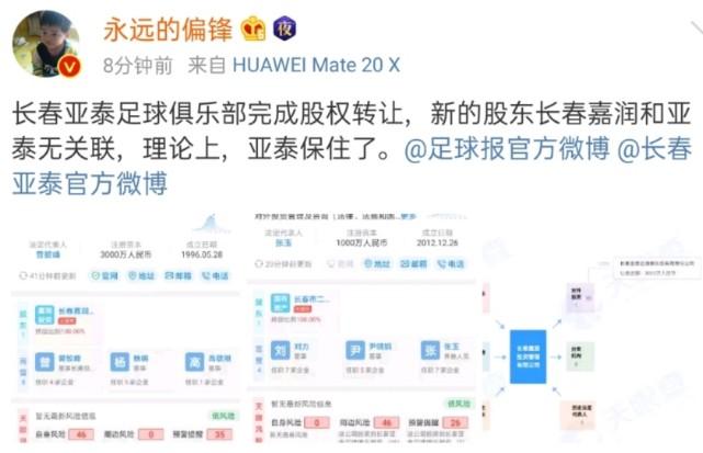 然而就在长春球迷认为“亚泰”这个名字可能保不住时,事情突然有了转机。根据企查查显示,长春亚泰俱乐部如今已经完成股权转让,长春嘉润投资管理有限公司100%控股,认缴投资日期为3天前的1月8日,而在长春嘉润旗下并无“亚泰”名称的企业。如此一来,长春亚泰完全符合了足协中性名的要求。而亚泰如此迅速的完成股权转让,也让打算使用该方法的北京国安和山东鲁能,都膜拜不已。