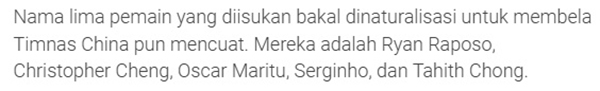 该印尼媒体甚至列出了5名球员的具体名单,分别是:Ryan Raposo(伍小海)、Christopher Cheng(郑泽彦)、Oscar Maritu(小奥斯卡)、Serginho(塞尔吉尼奥)、Tahith Chong(陈达毅)。