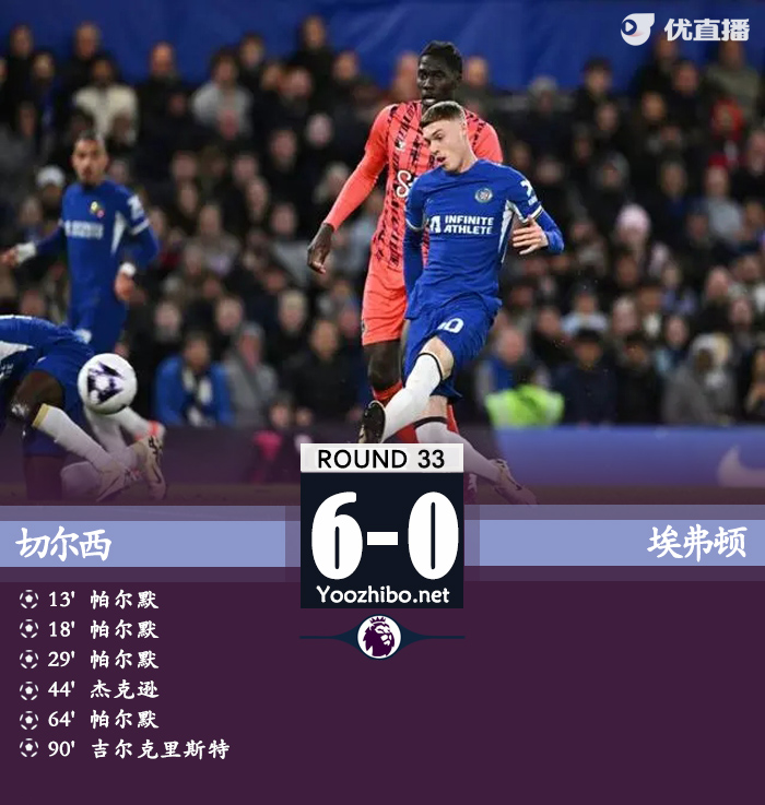 24直播网讯:北京时间4月16日,英格兰足球顶级联赛第33轮,切尔西在主场迎战埃弗顿。上半场,贝托近在咫尺空门打飞,雅克松助攻帕尔默远射入网,雅克松抽射被扑后帕尔默头球补射得手梅开二度,皮克福德乌龙助攻帕尔默吊射入网上演完美帽子戏法,杜库雷头球破门被判越位进球无效,库库雷利亚助攻雅克松停球打门得手;下半场,帕尔默造点并亲自罚进完成大四喜,奇尔韦尔射门被扑后吉尔克里斯特打进一线队首球。最终切尔西以6-0大胜埃弗顿。