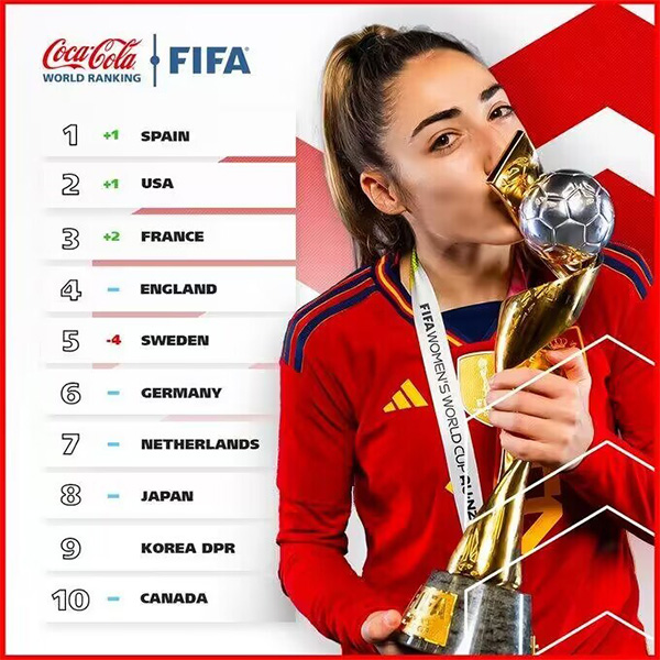 目前排在亚洲排名最高的是日本女足(世界第8),紧随其后的是朝鲜女足(第9)还有澳大利亚女足(第12),而韩国女足则排在中国女足之后,位列第20位。而其他国家女足方面,夺得世界杯冠军的西班牙女足高居第1,亚军英格兰则位列第4,美国和法国分居第2和第3位。