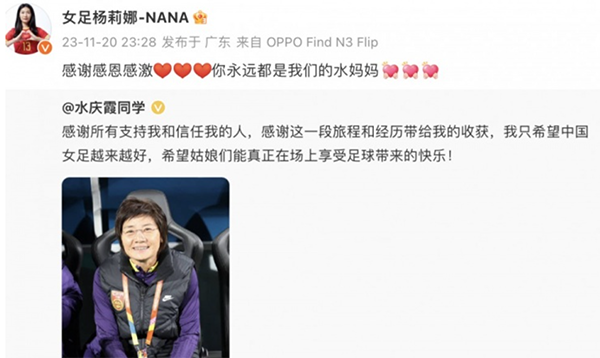 中国女足的球员、也是国足戴伟浚的绯闻女友杨莉娜在社媒上感谢和祝福水庆霞指导,称:“感谢感恩感激,你永远都是我们的水妈妈!”