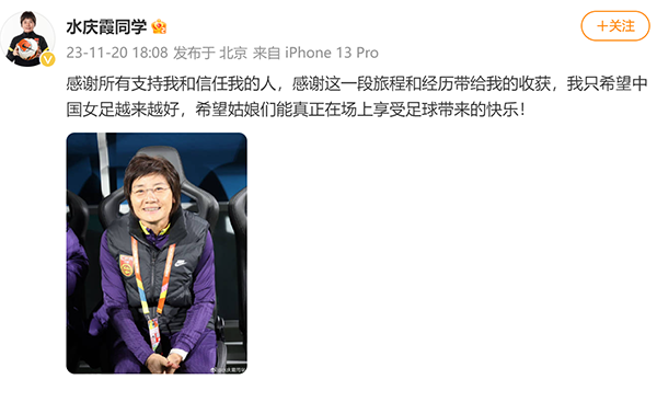 水庆霞下课之后,她在社交媒体上发声,感谢了所有支持她的人,并表示希望中国女足越来越好,希望姑娘们能真正在场上享受足球带来的快乐。不少球迷表示很感谢水庆霞指导,是她接手处于泥潭中的女足,然后拿下亚洲杯的冠军,虽然后期的战绩一般,但功绩不可抹杀。