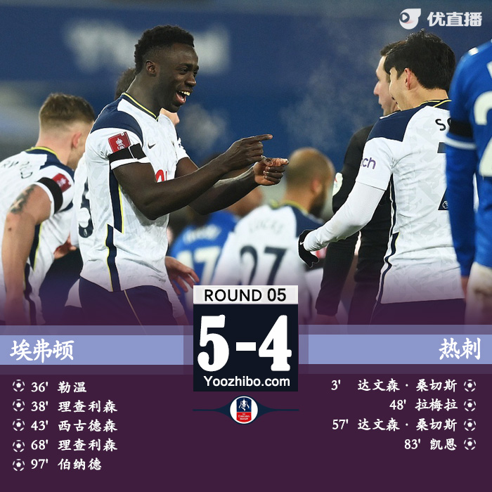 埃弗顿首发:33-奥尔森、12-迪涅(106`4-霍尔盖特)、5-迈克尔-基恩、13-米纳、22-戈弗雷、16-杜库雷、26-汤姆-戴维斯、10-西于尔兹松、7-里沙利松、17-伊沃比(69`20-伯纳德)、9-卡尔沃特-勒温(54`23-科尔曼)
