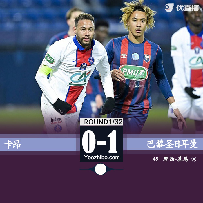 24直播网2月11日讯 北京时间2月11日,04:00法国杯1/32决赛,卡昂主场迎战巴黎圣日耳曼。上半场,双方都无明显破门良机,巴黎半场0-0卡昂。下半场,内马尔助攻,小基恩破门,随后内马尔因伤被姆巴佩换下。最终,巴黎客场1-0小胜卡昂。