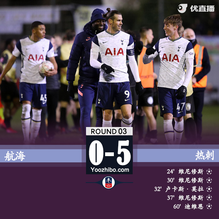 来源:24直播网01-11 14:39 24直播网讯:北京时间1月11日1:00,英格兰足总杯第3轮,热刺客场挑战航海。上半场,维尼修斯连下两城,小卢卡斯任意球破门,维尼修斯再入一球完成帽子戏法。下半场,16岁小将迪瓦恩抽射近角破门。全场比赛结束,热刺5-0大胜航海,晋级下一轮。